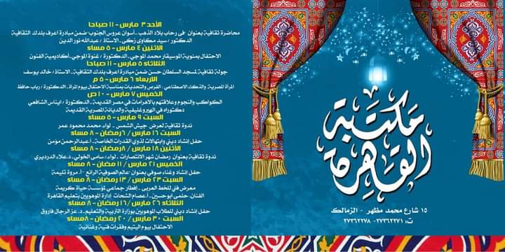 تنظم المكتبة تحت إشراف يحيى رياض يوسف القائم بأعمال مدير عام المكتبة ” وجبة ثقافية متعددة الفنون فى رمضان 2024 بمكتبة القاهرة الكبرى بالزمالك