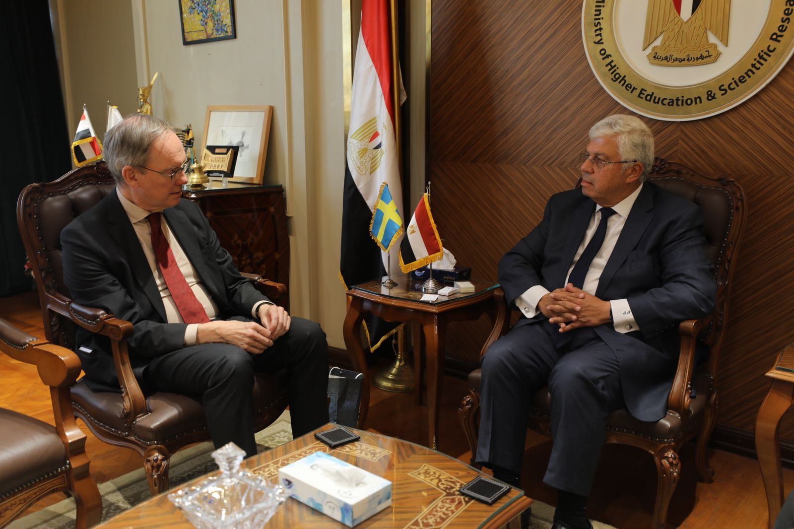 في بداية اللقاء، أبدى الوزير اهتمام مصر الكبير بتعزيز التعاون العلمي والبحثي مع مملكة السويد، مشيدًا بالتعاون المتميز والعلاقات الوطيدة بين البلدين، مؤكدًا تطلع مصر لتعميق هذه العلاقات في كافة المجالات، وبخاصة مجالات التعليم العالي والبحث العلمي، والرعاية الصحية، والتعليم التكنولوجي.