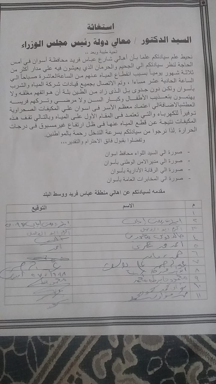 ويضيف جابر خلف أنه أصبح اطالفنا يصرخون من عدم وجود المياه ومن شدة الحر مما أصابهم بالبكاء الدائم والصراخ فنحن أهالي منطقة وسكان شارع عباس فريد بأسوان نستغيث بكافة المسؤولين بشركة مياه الشرب والصرف الصحى بأسوان وبرئيس مجلس إدارة الشركة القابضة للمياه الشرب والصرف الصحى الي متي هذا الإهمال بأرواح الناس ومن السكان بهم مرضي ويعانون الألم والمرضى.