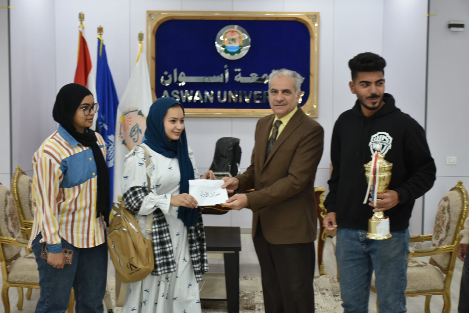 وقام الأستاذ الدكتور لؤي سعد الدين نصرت، القائم بأعمال رئيس جامعة أسوان، بتسليم كأس المعرفة للطلاب الفائزين بالمركز الأول، إلى جانب تكريم وتسليم الجوائز المالية لطلاب المركزين الثاني والثالث، وذلك بحضور مسؤولي رعاية الطلاب وعدد من أعضاء هيئة التدريس.