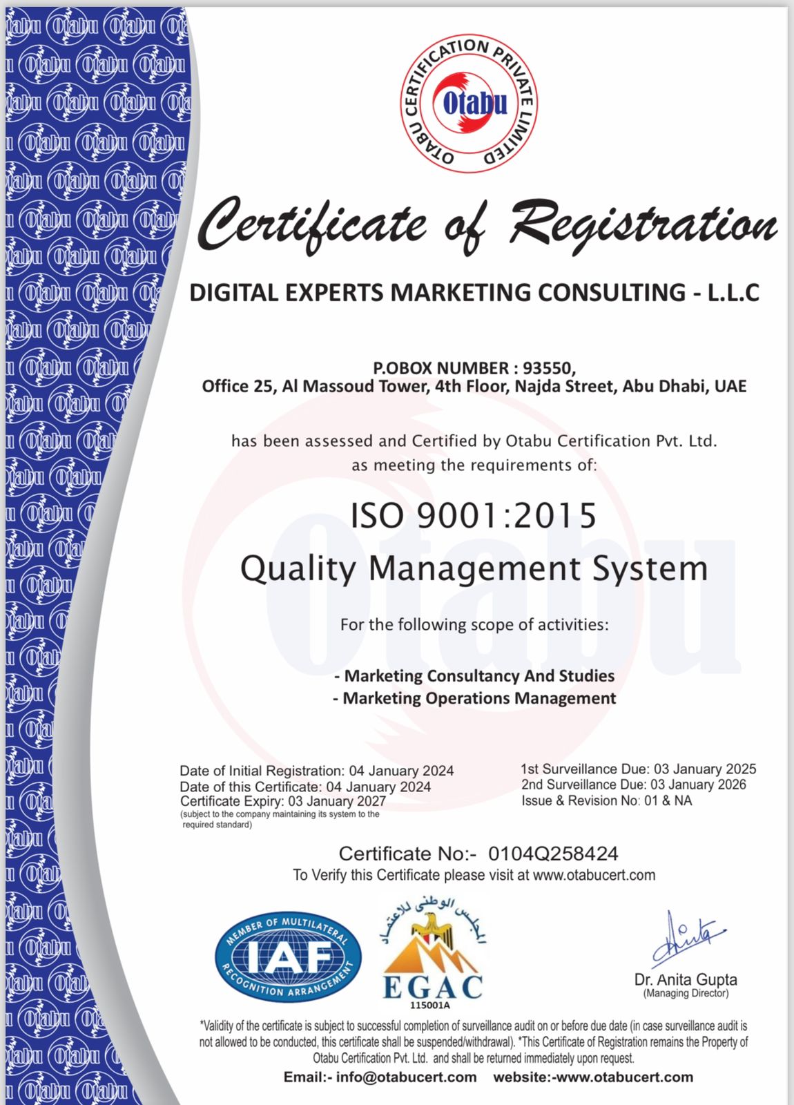 إستهلت شركة خبراء الديچيتال الرائدة في مجال تسويق المقاصد السياحية الدولية، العام الجديد بالحصول على 3 شهادات من الأيزو (ISO) الأولى ISO 9001 شهاده إدارة الجودة فى الٱدارة QMS ،