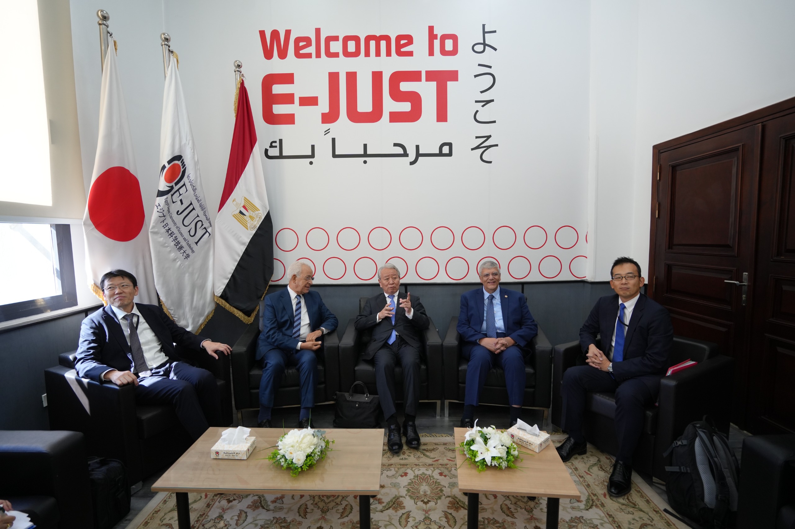 استقبل الدكتور هاني هلال رئيس مجلس أمناء الجامعة المصرية اليابانية للعلوم والتكنولوجيا، والدكتور عمرو عدلي رئيس الجامعة، أمس بمقر الجامعة في برج العرب، البروفيسور أكيهيكو تاناكا رئيس هيئة التعاون الدولي اليابانية (JICA)، ووفد مرافق له رفيع المستوى من هيئة الجايكا بطوكيو ومن مكتب الجايكا بالقاهرة.