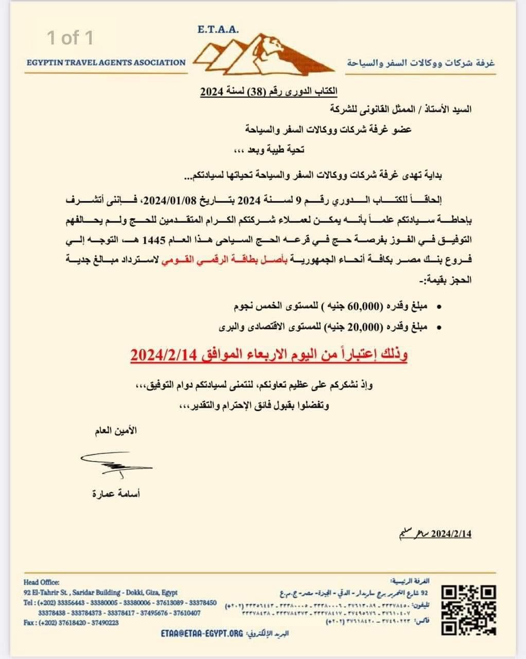 أخطرت غرفة شركات السياحة اعضائها من شركات السياحة خاصة المنظمة لرحلات الحج لهذا العام بالتواصل مع المواطنين الذين قاموا بدفع مبلغ لحجز الحج بانه يمكن للعملاء المتقدمين للحج ولم يحالفهم التوفيق فى الفوز بقرعة الحج السياحى هذا العام التوجه الى فروع بنك مصر بكافة انحاء الجمهورية لإسترداد مبلغ جدية الحجز بقيمة ” ٦٠ الف جنية ” للمستوى الخمس نجوم ومبلغ ” ٢٠ الف جنيه” للمستوى الاقتصادي وذلك بأصل البطاقة الشخصية.