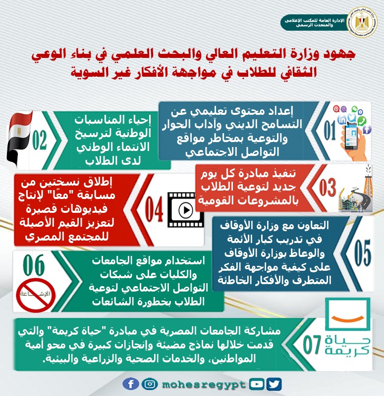 ومن جانبه، أكد الدكتور عادل عبدالغفار المُستشار الإعلامي والمُتحدث الرسمي للوزارة، حرص الوزارة على دعم الجهود التي تستهدف رفع وعى طلاب الجامعات بالأفكار الصحيحة والقيم الدينية السمحة، وتعريفهم بالقضايا الوطنية، وحمايتهم من الأفكار الهدامة وغير السوية، والاهتمام بدعم بناء شخصية الطالب على المستوى العلمي، والبدني، والثقافي، وذلك من خلال تنظيم الندوات، والمحاضرات، والورش التدريبية، وعقد المسابقات الثقافية والفنية، ونشر المواد الإعلامية التوعوية، وتشجيع الطلاب على المشاركة في الأنشطة الاجتماعية والثقافية، تنفيذًا للإستراتيجية الوطنية للتعليم العالي والبحث العلمي 2030.